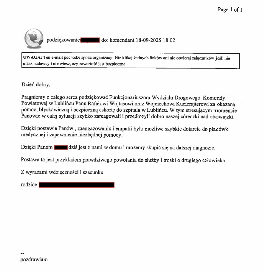 Po koniec sierpnia 2025 roku policjanci z Wydziału Ruchu Drogowego KPP w Lublińcu zatrzymali do kontroli pojazd, który przekroczył dozwoloną prędkość. Jak się okazało, za kierownicą siedziała zdenerwowana kobieta, która spieszyła się do chorego dziecka mającego poważne problemy z oddychaniem. Policjanci natychmiast podjęli decyzję o eskorcie rodziców wraz z córką do lublinieckiego szpitala. Dzięki ich szybkiej reakcji dziecko zostało w porę objęte opieką medyczną ratującą jego życie. Rodzice dziewczynki przesłali policjantom serdeczne podziękowania, podkreślając ich empatię i profesjonalizm.