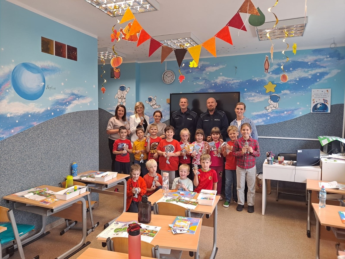 Dzięki wsparciu Gminnej Komisji Rozwiązywania Problemów Alkoholowych w Koszęcinie, każdy uczeń otrzymał praktyczne upominki: odblaskowe misie, kolorowanki edukacyjne oraz ulotki przypominające o zasadach bezpieczeństwa.