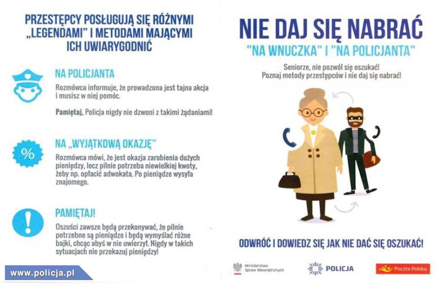 Policjanci cały czas apelują o ostrożność, ponieważ przestępcy nie ustępują w bezprawnych działaniach i nadal dzwoniąc, podszywają się pod funkcjonariuszy publicznych. W trakcie rozmowy telefonicznej oszuści wykorzystują różne scenariusze. W takim scenariuszu bez znaczenia jest czy jest to fałszywy policjant, prokurator, wnuczek, córka, pracownik wodociągów czy narodowego funduszu zdrowia, cel zawsze jest ten sam wyłudzić jak najwięcej pieniędzy. Wielu seniorów, kierując się odruchem serca czy chęcią pomocy daje wiarę w opowiedziany scenariusz i często tracąc oszczędności całego życia.
