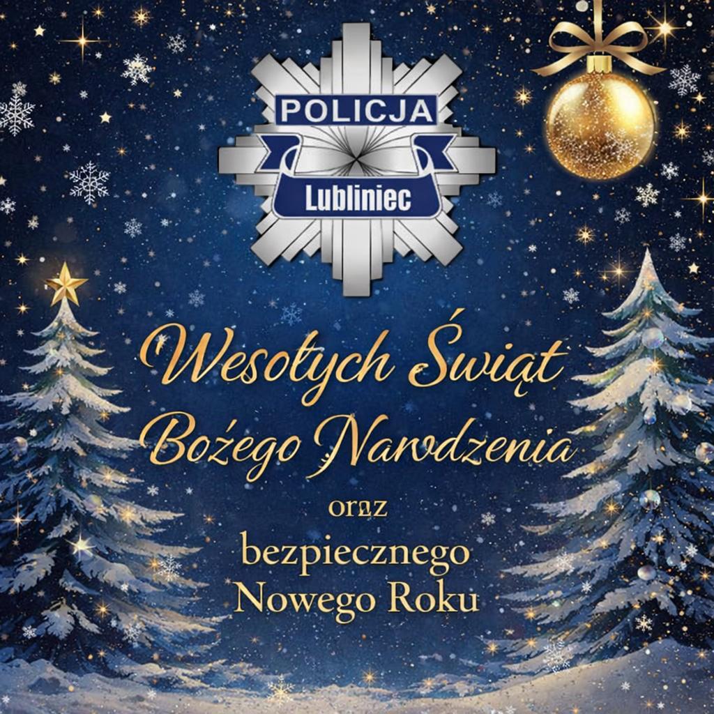 Komendant Powiatowy Policji w Lublińcu inspektor Mariola Biskup wraz z I Zastępcą Komendanta Powiatowego Policji młodszym inspektorem Mieczysławem Krysiakiem składają wszystkim policjantkom i policjantom, pracownikom cywilnym, policyjnym emerytom oraz mieszkańcom powiatu lublinieckiego życzenia zdrowych, spokojnych i radosnych Świąt Bożego Narodzenia oraz wszelkiej pomyślności w nadchodzącym 2026 roku.