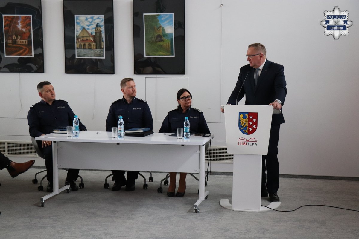 • na zdjęciu widocznych jest troje umundurowanych policjantów siedzących przy stole obok przy mównicy stoi mężczyzna