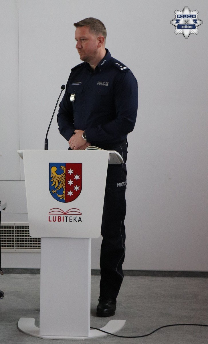 • na zdjęciu widoczny jest umundurowany policjant stojący za mównicą