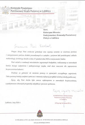 • na zdjęciu jest widoczny list gratulacyjny od Komendy Regionalnej Straży Ochrony Kolei w Katowicach  Posterunek Straży ochrony Kolei w Tarnowskich górach. W piśmie zawarte są podziękowania za wspólna współpracę oraz wyrażona chęć dalszych wspólnych  działań