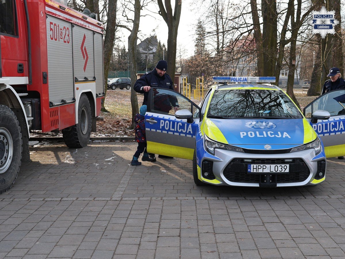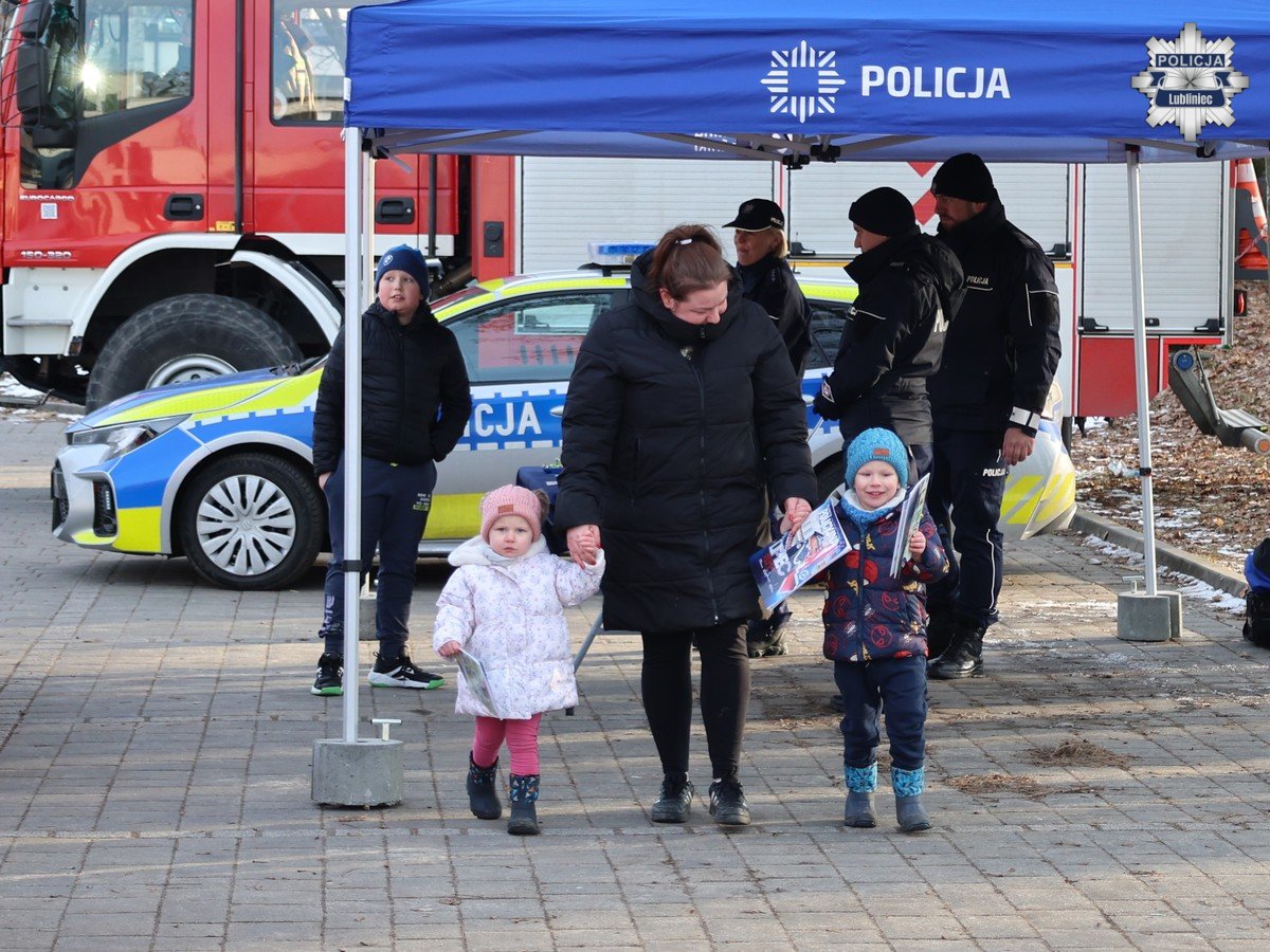 Dzieci mogły z bliska zobaczyć sprzęt strażacki oraz radiowóz policyjny używany w codziennej służbie. Uczestnicy mieli również okazję porozmawiać o pracy w służbach mundurowych.