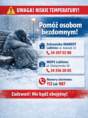 W okresie silnych mrozów zwracajmy szczególną uwagę na osoby bezdomne oraz samotne, które mogą potrzebować pomocy. Każda reakcja może uratować czyjeś zdrowie lub życie.