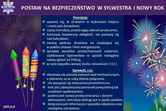 Zbliża się okres noworoczny, więc w sklepach można kupić fajerwerki. Pamiętajmy, że w trakcie korzystania z petard i tego typu asortymentu musimy zachować szczególną ostrożność i rozsądek. Są one materiałami wybuchowymi, które mogą być niebezpieczne dla życia i zdrowia. Używajmy fajerwerków tylko w takim miejscu, w którym nie spowodują one zagrożenia dla innych oraz nie wywołają pożaru.